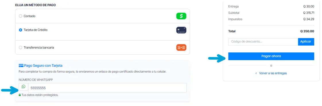 Cuando llegues al paso de pago de tus productos y selecciones la opción “Tarjeta de Crédito”, se habilitará un campo para que ingreses tu número de WhatsApp.