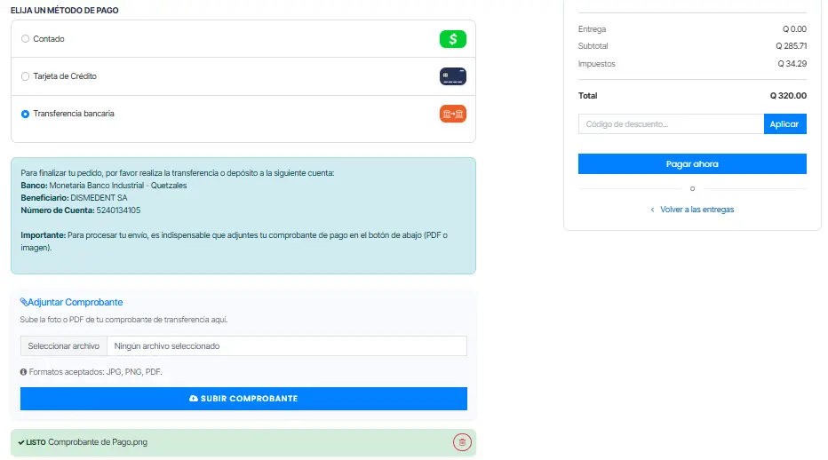 Mientras no se suba el comprobante, la opción “Pagar ahora” permanecerá deshabilitada.
